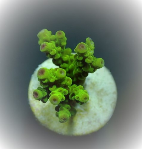 Coral marinho verde com pontas amarelas em base redonda sobre fundo escuro