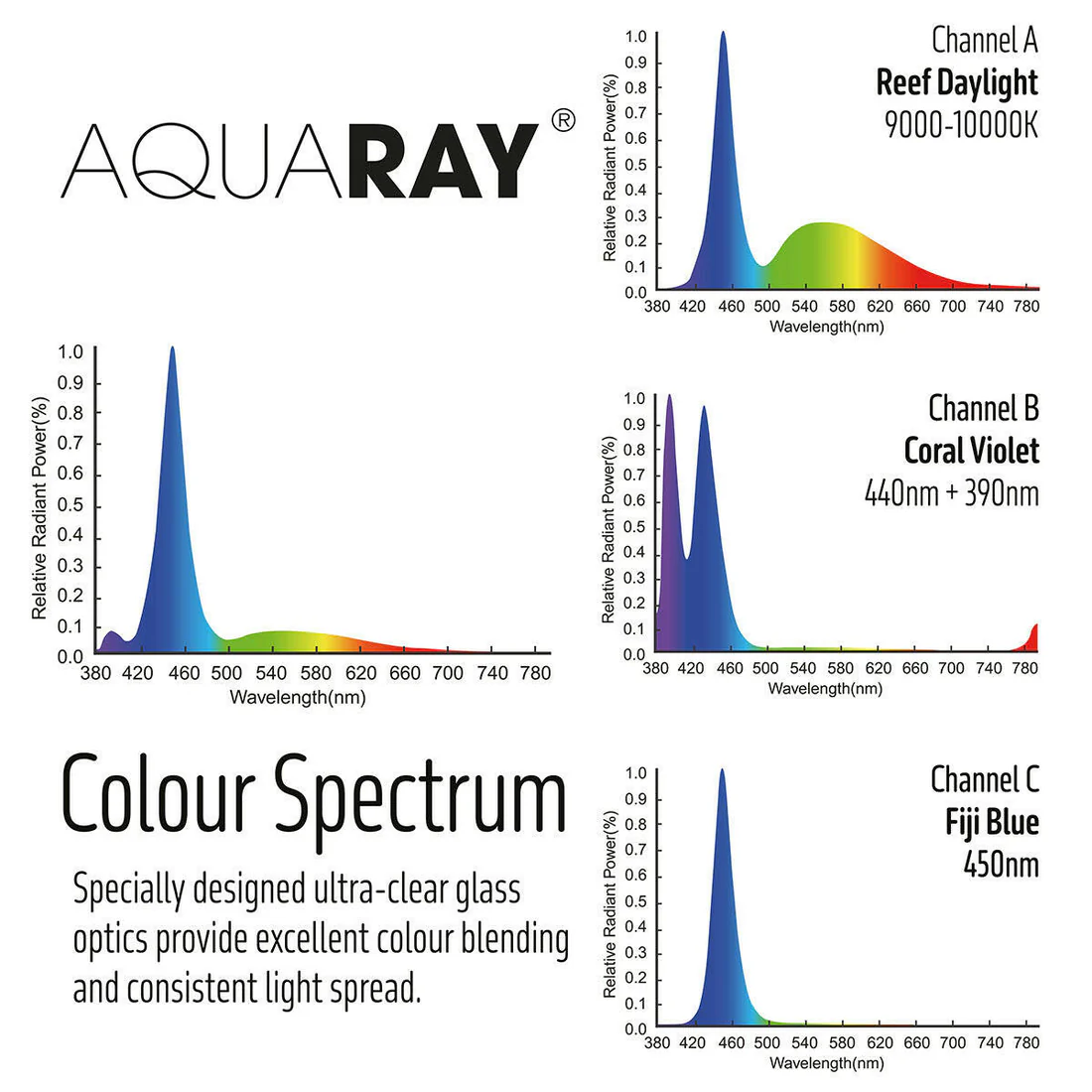 Coral Violet (440nm + 390nm): Desenvolvido em colaboração com laboratórios de investigação, este espectro é comprovado para melhorar a pigmentação e fluorescência dos corais.