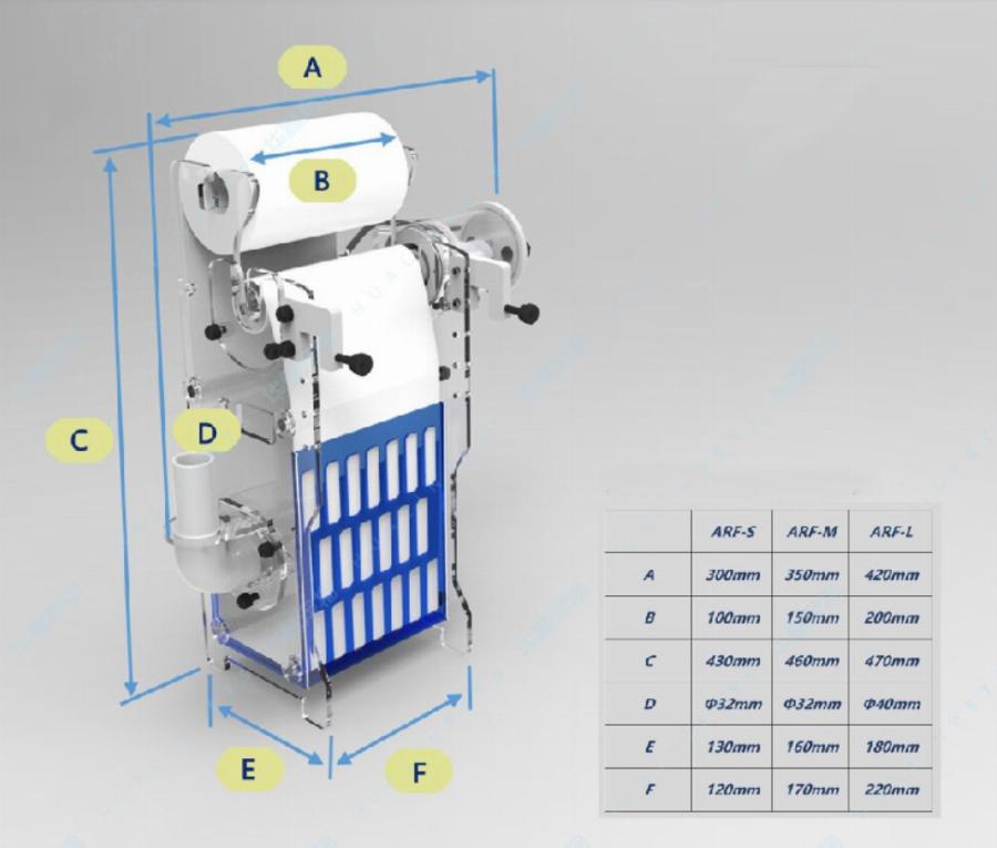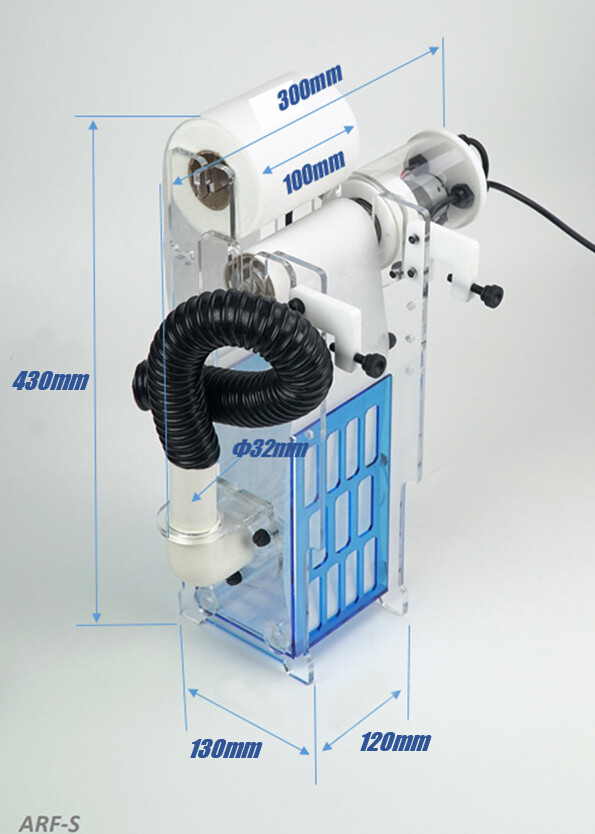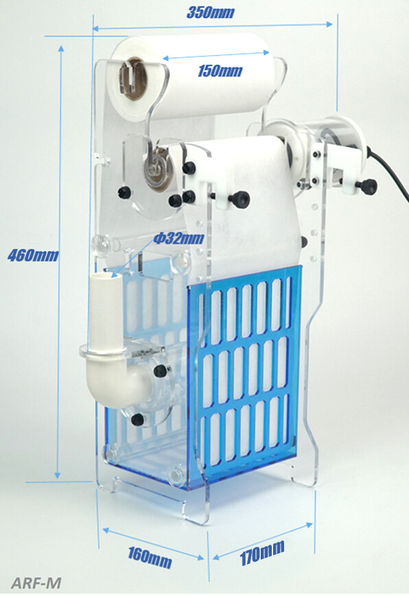 O filtro automático Bubble Magus elimina a necessidade de meias. A água entra na câmara interna pelo dreno e pelo rolo do filtro. À medida que o filtro fica obstruído devido à sua função de limpeza, o nível da água aumenta na câmara do filtro, que ativa a válvula incorporada na parte superior e avança automaticamente o rolo, expondo a parte não utilizada do filtro até que o nível da água caia novamente. Esse ciclo é repetido toda vez que a mídia começa a entupir, o que impede a liberação de compostos orgânicos na água do aquário.