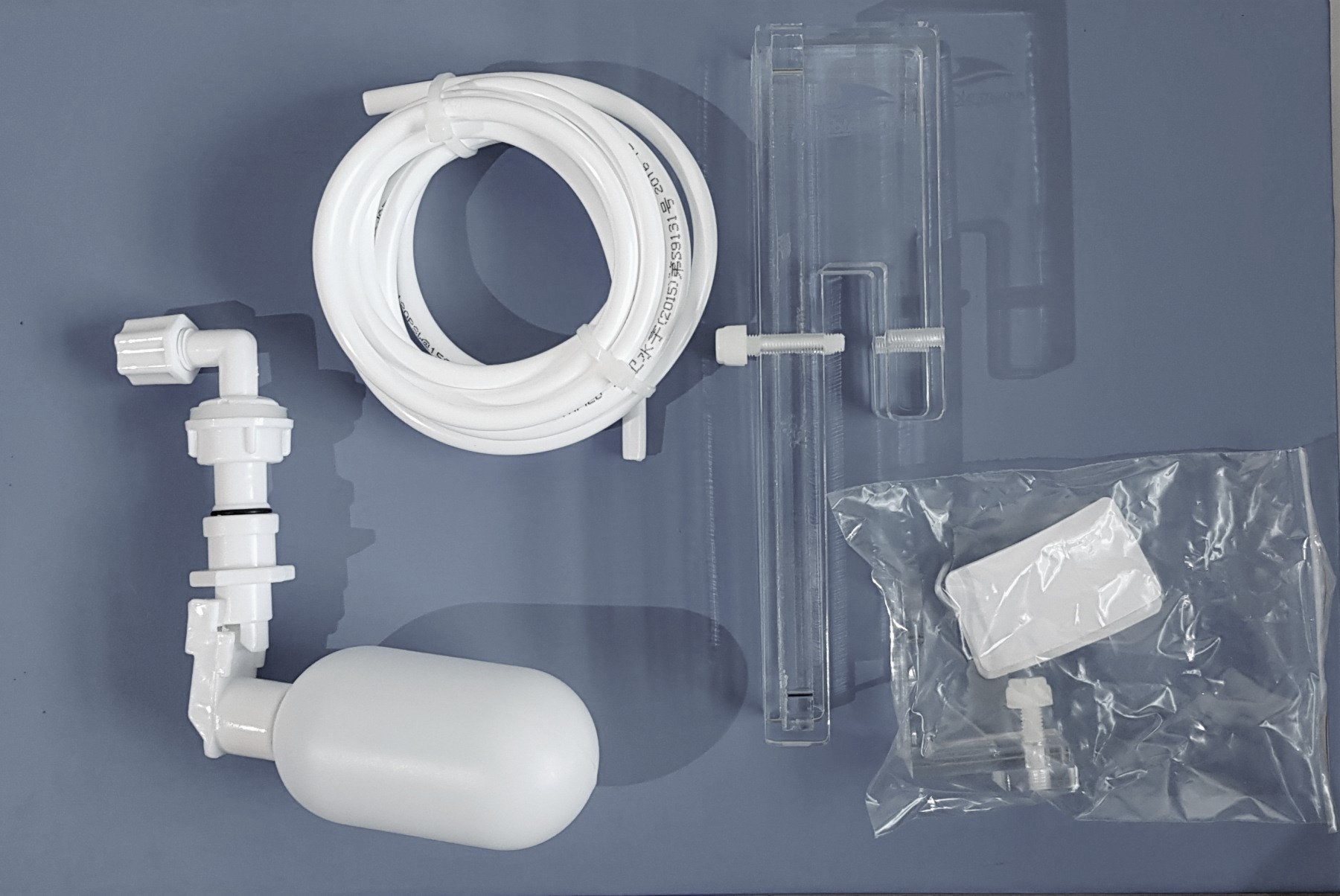 Peças plásticas brancas e tubo flexível com acessórios para medição e controlo