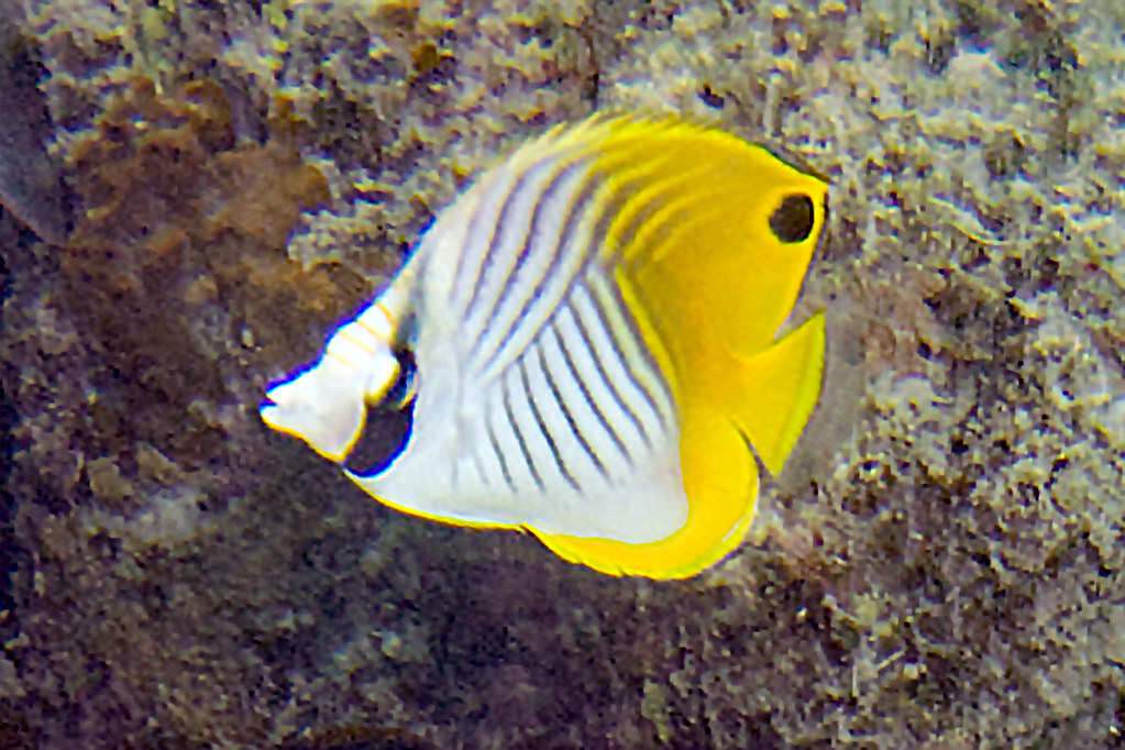 Difundido na maior parte do Indo-Pacífico e Mar Vermelho. Pequenas diferenças de cor entre a população do Mar Vermelho e a do Indo-Pacífico. Geralmente é uma espécie comum encontrada nos habitats costeiros e externos dos recifes. Juvenis frequentemente em portos e estuários. Os adultos formam pares na maioria das áreas, mas em alguns locais oceânicos essa espécie pode se formar. Facilmente identificado por seu corpo branco com a viga escura e linhas diagonais bidirecionais no corpo, e grande região amarela sobre a parte traseira e as barbatanas. Os juvenis têm uma barra preta na cabeça que esconde o olho e uma mancha preta do tamanho de um olho na barbatana dorsal macia. A faixa da cabeça desaparece nos olhos dos adultos e na população do Mar Vermelho as manchas da barbatana dorsal desaparecem. Comprimento até 23cm.