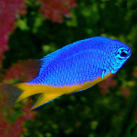 Regal Damsel, Chrysiptera hemicyanea é nativa do leste do Oceano Índico e do oeste do Pacífico. É principalmente de cor azul brilhante, com um fundo amarelo brilhante e atinge 7 cm de comprimento.