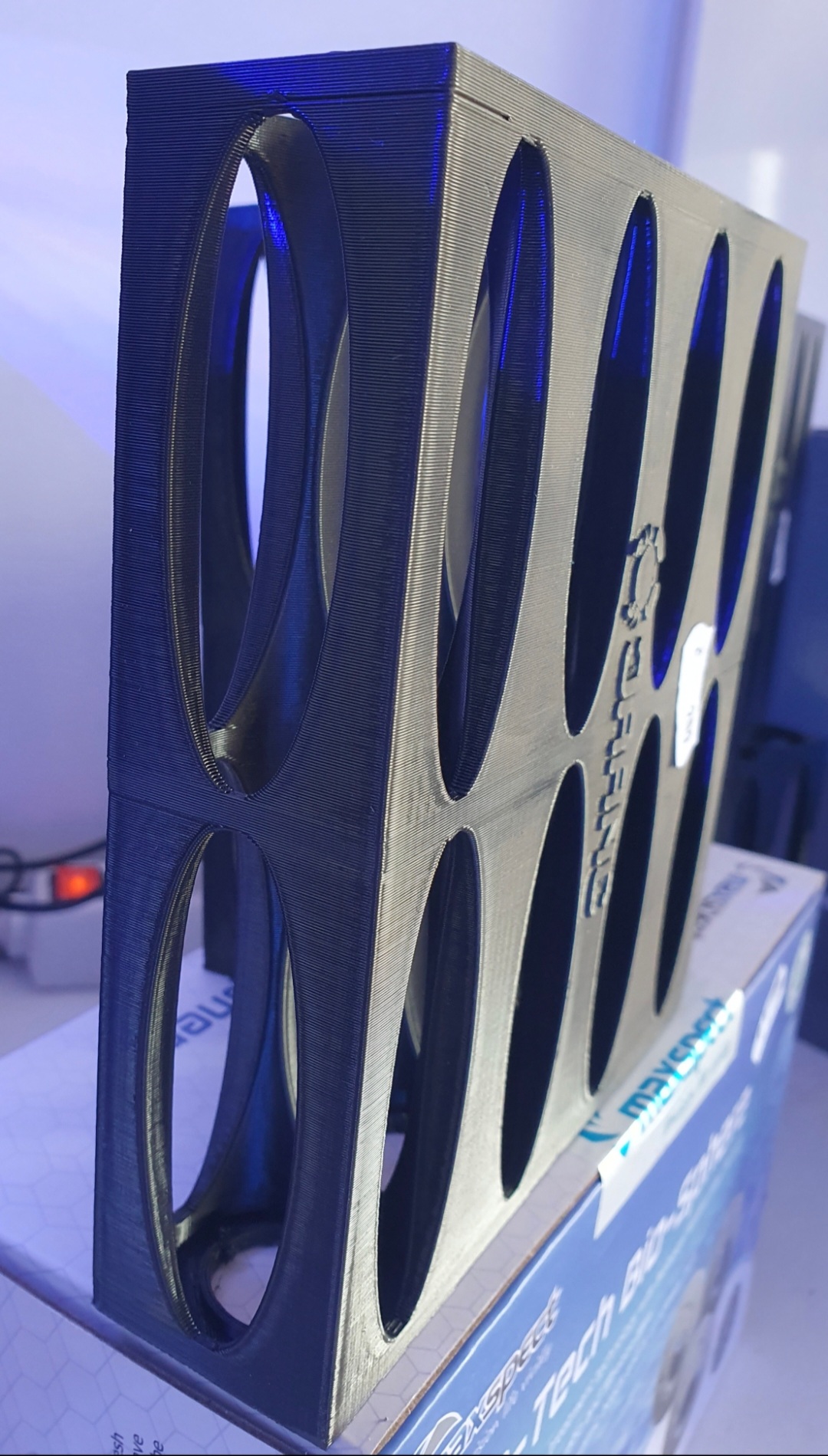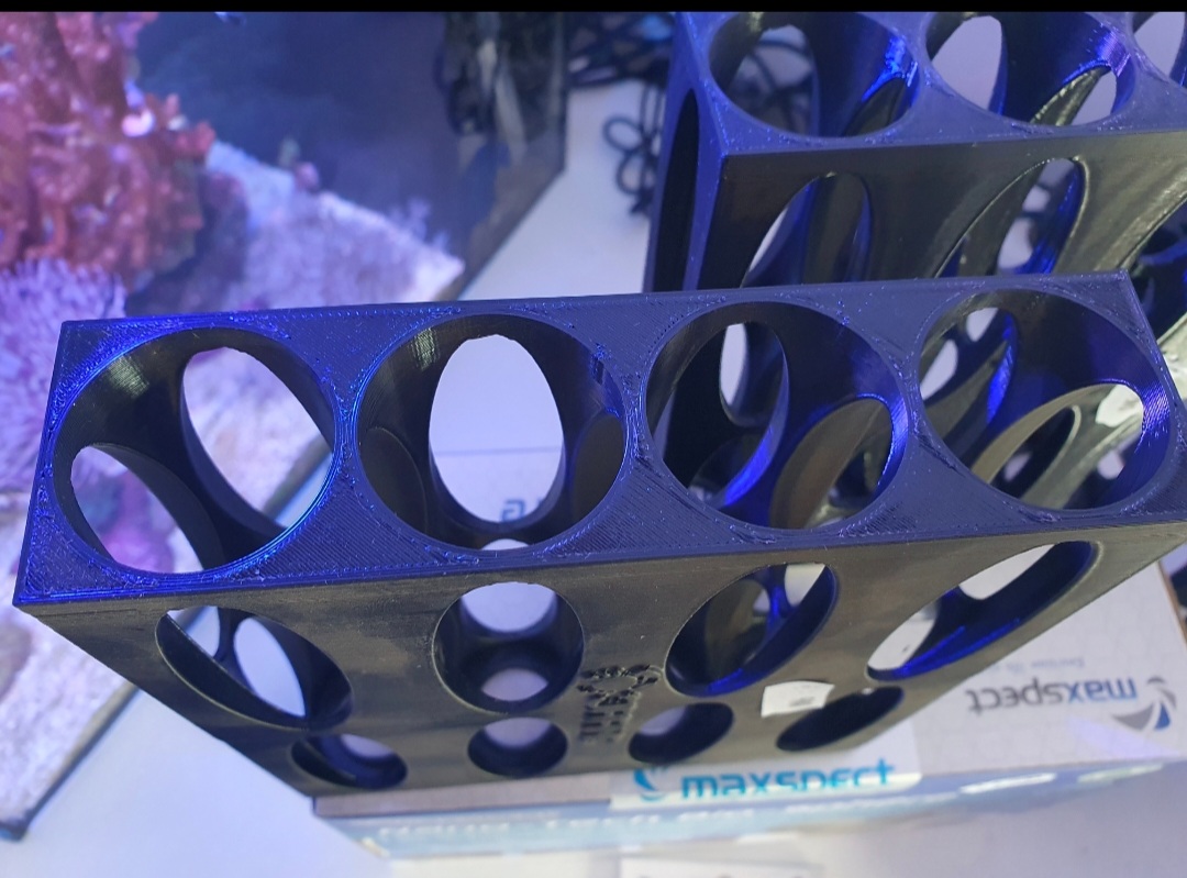 Suporte preto em plástico com orifícios circulares sobre caixa Maxspect
