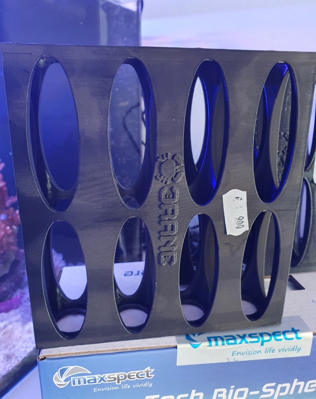 Suporte preto Maxspect Bio-Sphere com várias aberturas ovais em plástico sobre embalagem azul