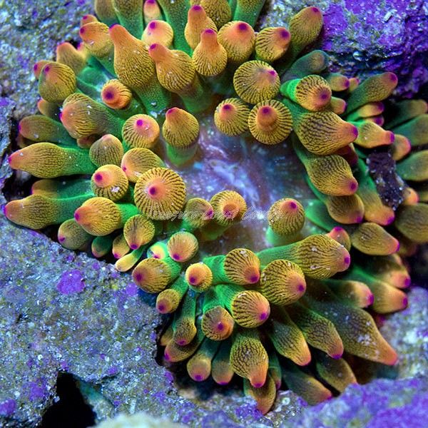 Anêmona marinha amarela com pontas rosa em rochas algosas