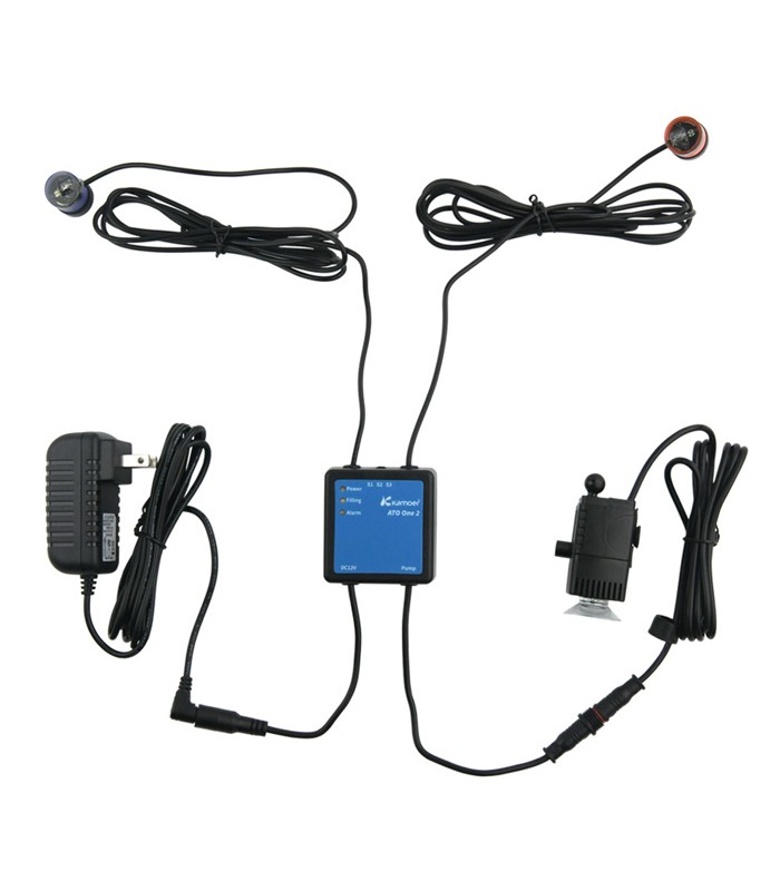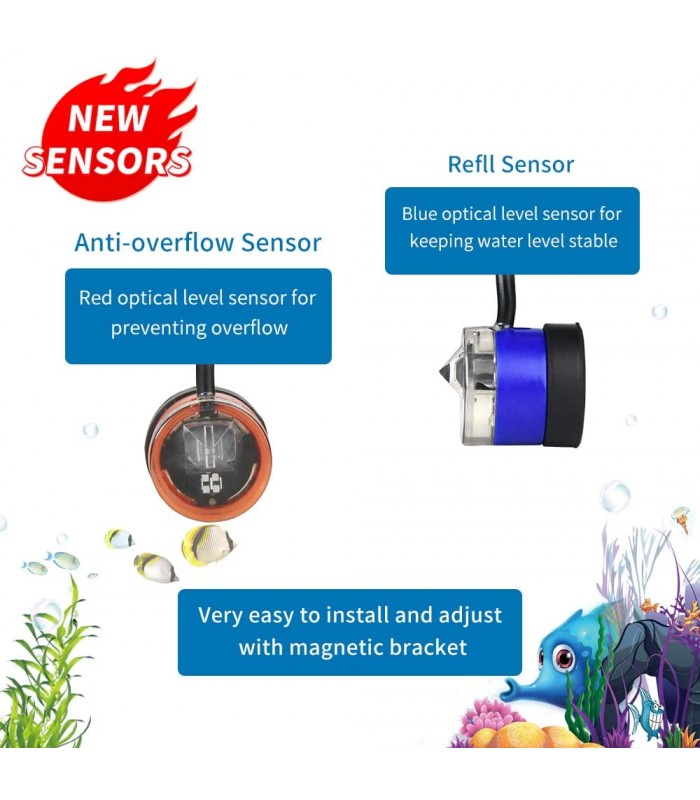 ATO One 2 SE é a versão padrão com bomba submersível, precisa apenas instalar o sensor e a bomba submersível, que pode ser usada após ligar sem ajuste. O sensor é fixado por ímã, o que é conveniente para instalação e ajuste. Equipado com sensor de nível óptico, o sensor de nível óptico azul é usado para monitorar o nível de água e decidir se deve reabastecer a água, o sensor de nível óptico vermelho é usado para evitar o transbordamento. ATO One 2 SE tem indicação de status rica, quando a água de reabastecimento transborda ou horas extras, quando a água no recipiente de recarga é insuficiente, ATO One 2 SE terá luz indicadora e alarme sonoro.
