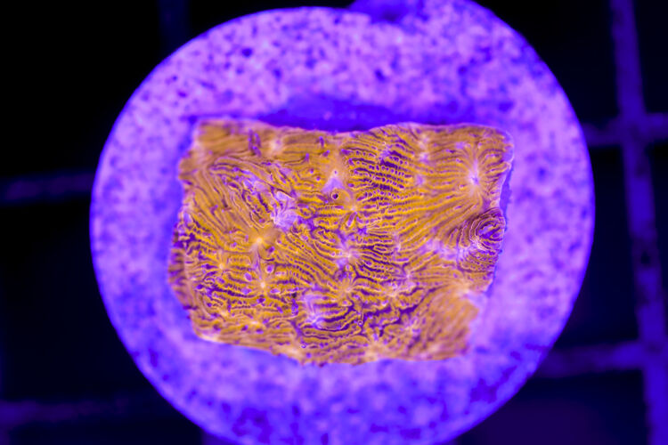 Fragmento de coral laranja em base branca sobre fundo escuro