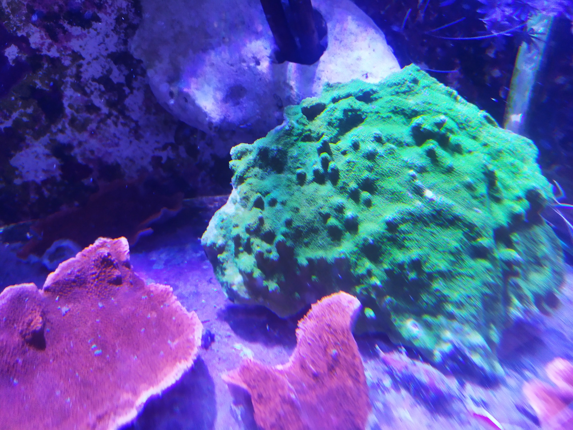 Fragmentos de coral marinho vermelho e verde em aquário com iluminação azul