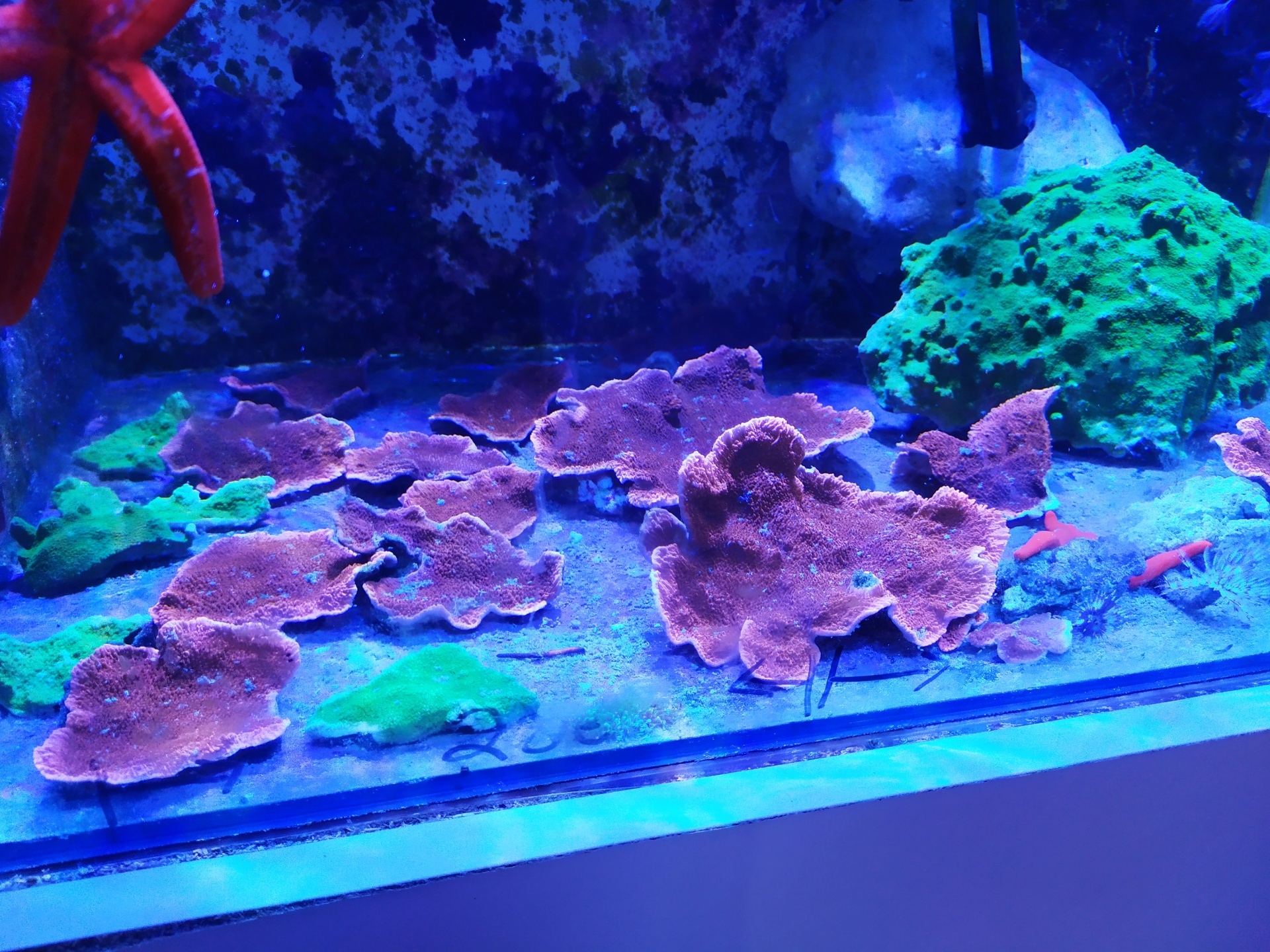 Aquário com rochas decorativas roxas e verdes, iluminação azul, estrela-do-mar vermelha