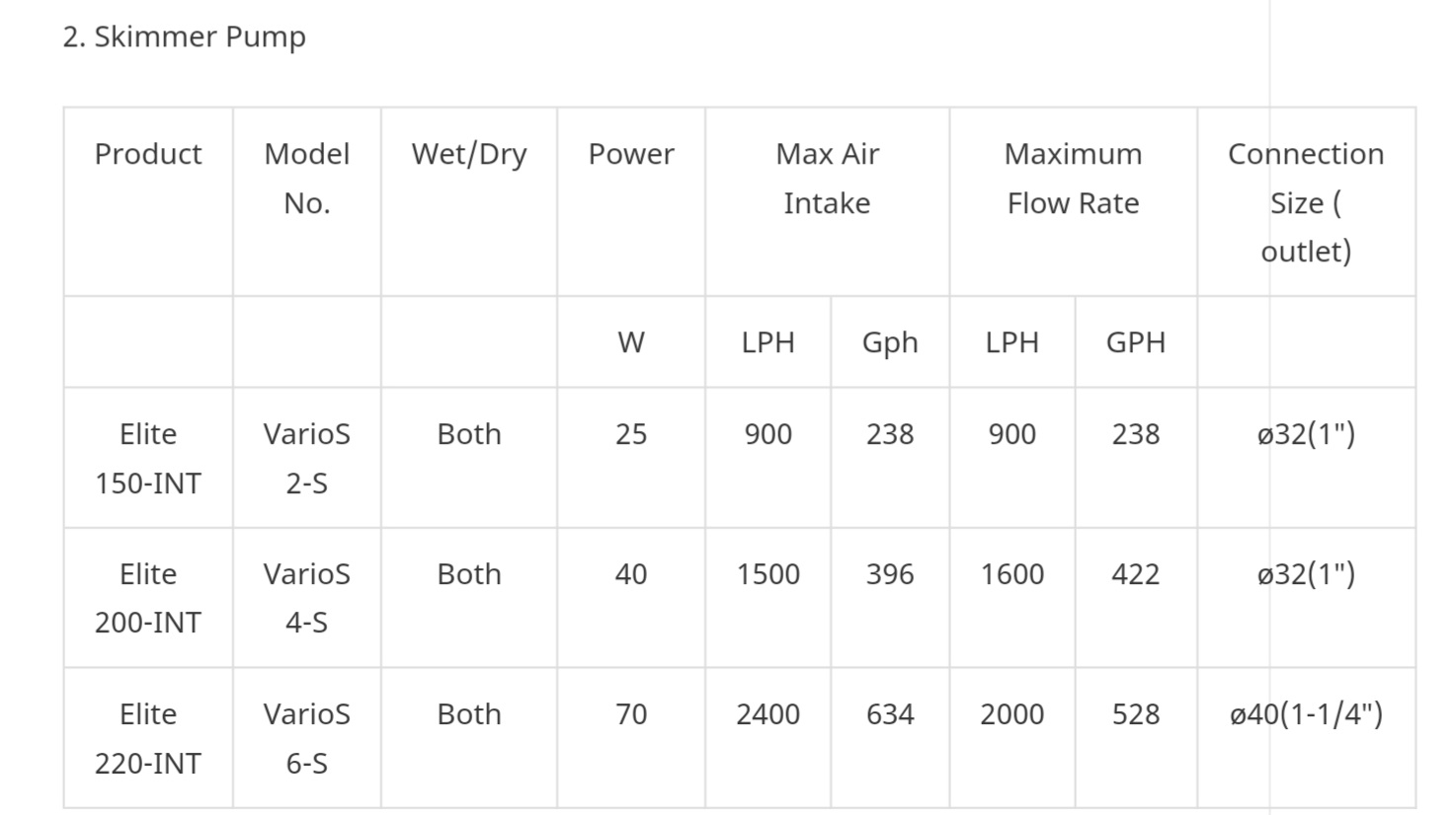 Elite-S é alimentado por sua própria bomba skimmer controlável, a VarioS . Possui um rotor cata-vento, controlador removível, eixo cerâmico de alta qualidade e rolamento para reduzir o desgaste. Também incorpora a mais recente tecnologia de fluxo de velocidade variável para controle refinado, melhor desempenho, maior eficiência energética e operações mais seguras. Em condições normais de utilização, a bomba VarioS tem uma vida útil/vida útil do produto esperada de 10 anos.