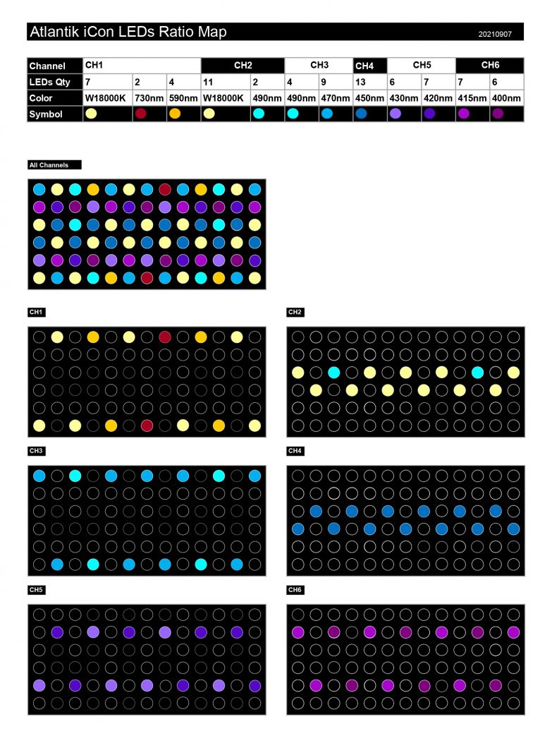 Orphek pesquisou e desenvolveu cada canal com uma combinação de cores e quantidade de LEDs com base nas necessidades dos corais; respeitando sua resposta natural aos comprimentos de onda da luz; e fornecer o melhor espectro de cores, saúde e crescimento, ao mesmo tempo que dá ao seu aquário uma aparência natural, imitando a natureza em sua plenitude.