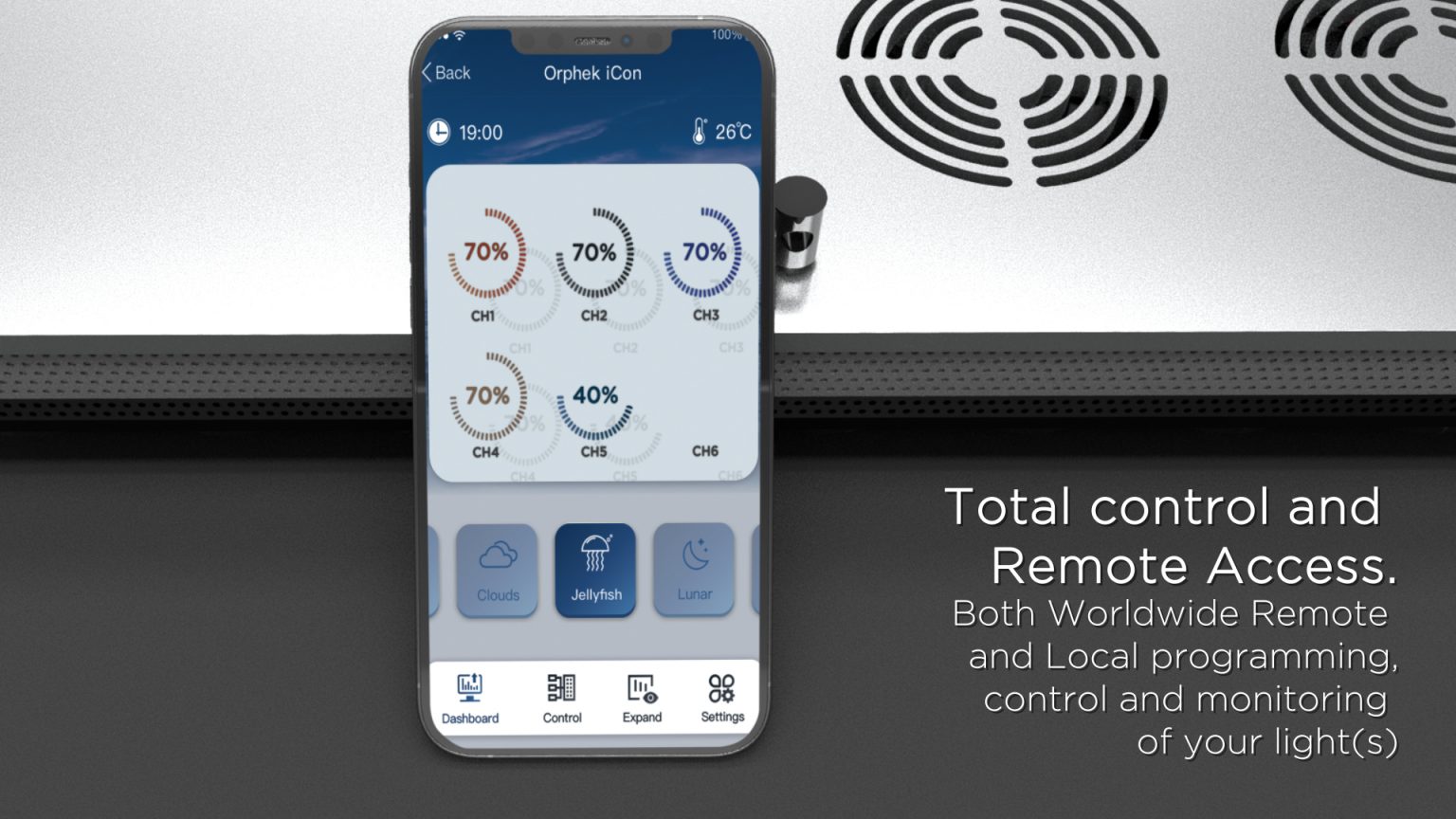 A Orphek oferece no Atlantik iCon capacidade de escurecimento progressivo total em todos os canais. Os primeiros no mundo a oferecer sistema de controle de escurecimento de 1000% (0-100% e 0,1-1% para o ciclo lunar)!