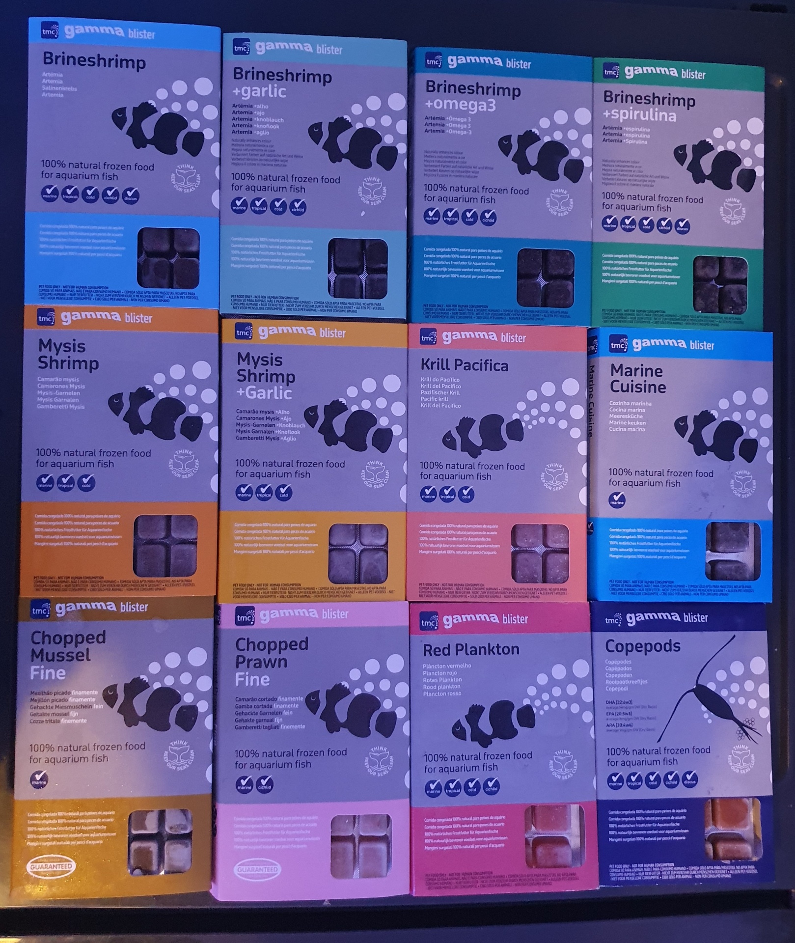 Todos os alimentos Gamma TMC são irradiados com radiação Gama, eliminando completamente qualquer risco de introdução de parasitas ou bactérias nocivas no seu aquário, e também significa que a comida é completamente segura para armazenar no seu congelador.