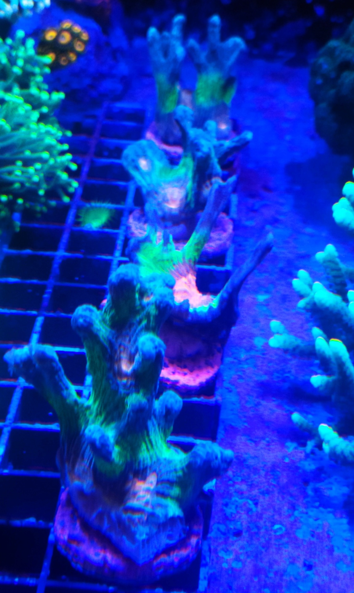 Corais coloridos verdes, azuis e rosa em estrutura metálica sob luz azul