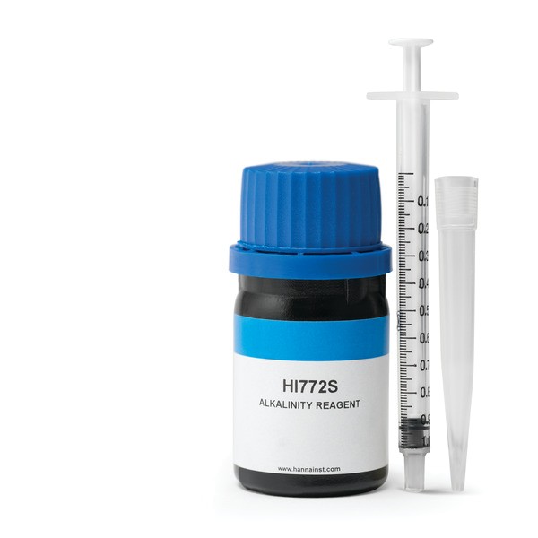 frasco de reagente HI772S com seringa e tampa plástica no fundo branco