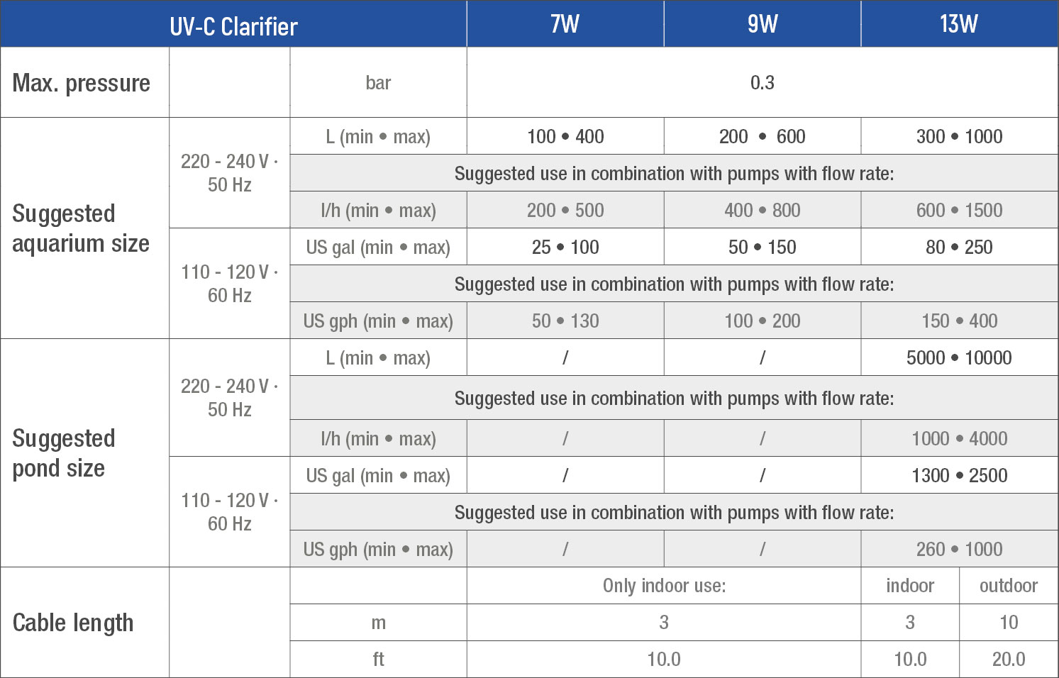 O UV-C Clarifier é totalmente submersível (IP68). Pode ser imerso diretamente no reservatório do lago ou aquário. Possui um interruptor de segurança que desativa automaticamente a lâmpada UV-C durante a manutenção. Seus tamanhos compactos o tornam adequado para uso em aquários, tanques de tartarugas e lagoas.