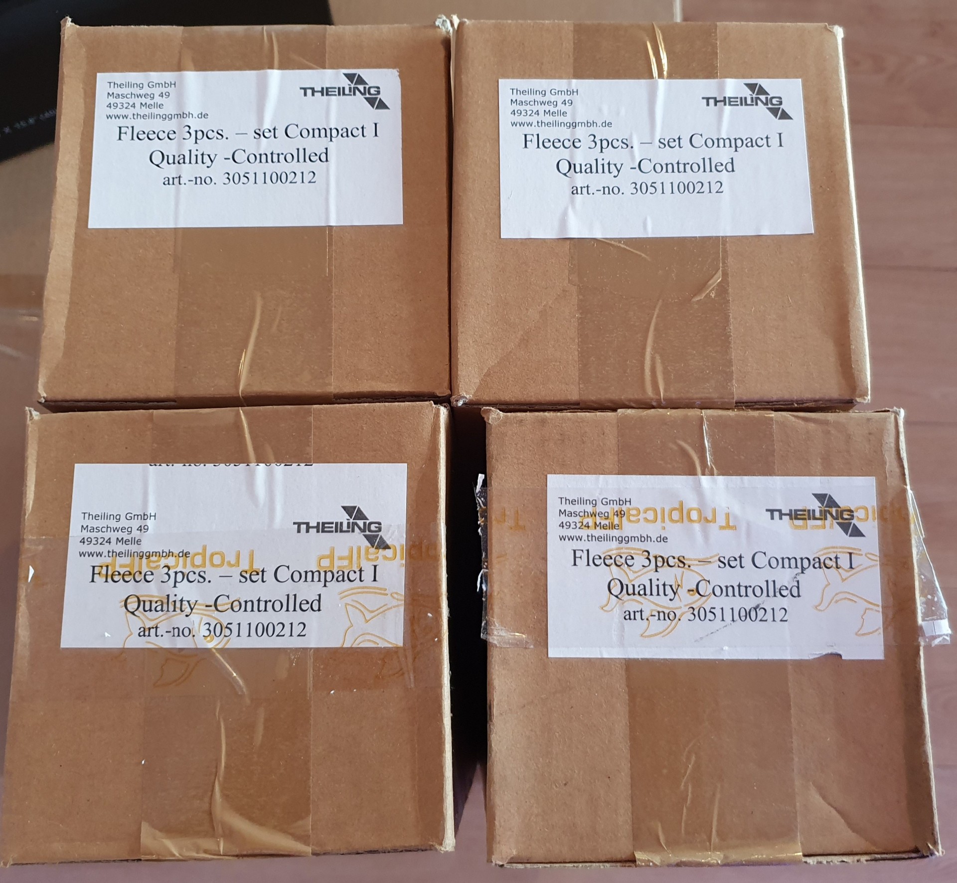 Quatro caixas de papelão com etiquetas de conjuntos de fleece compactado da marca Theiling