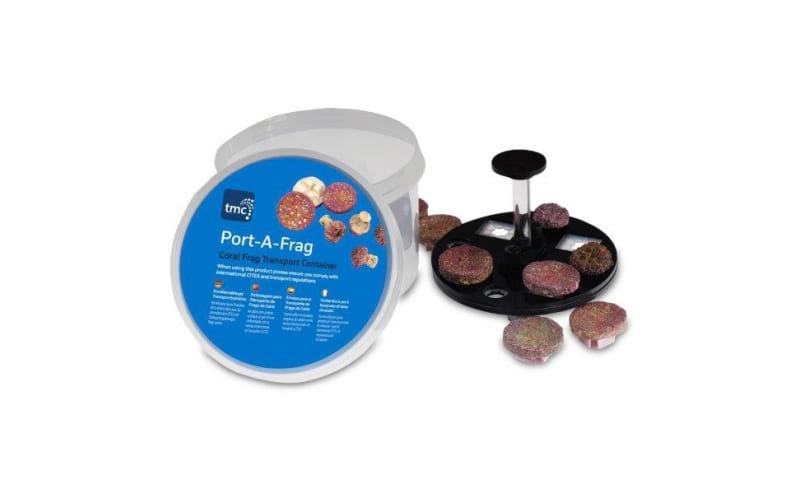 Porta fragmentos de coral com embalagem branca e rótulo azul