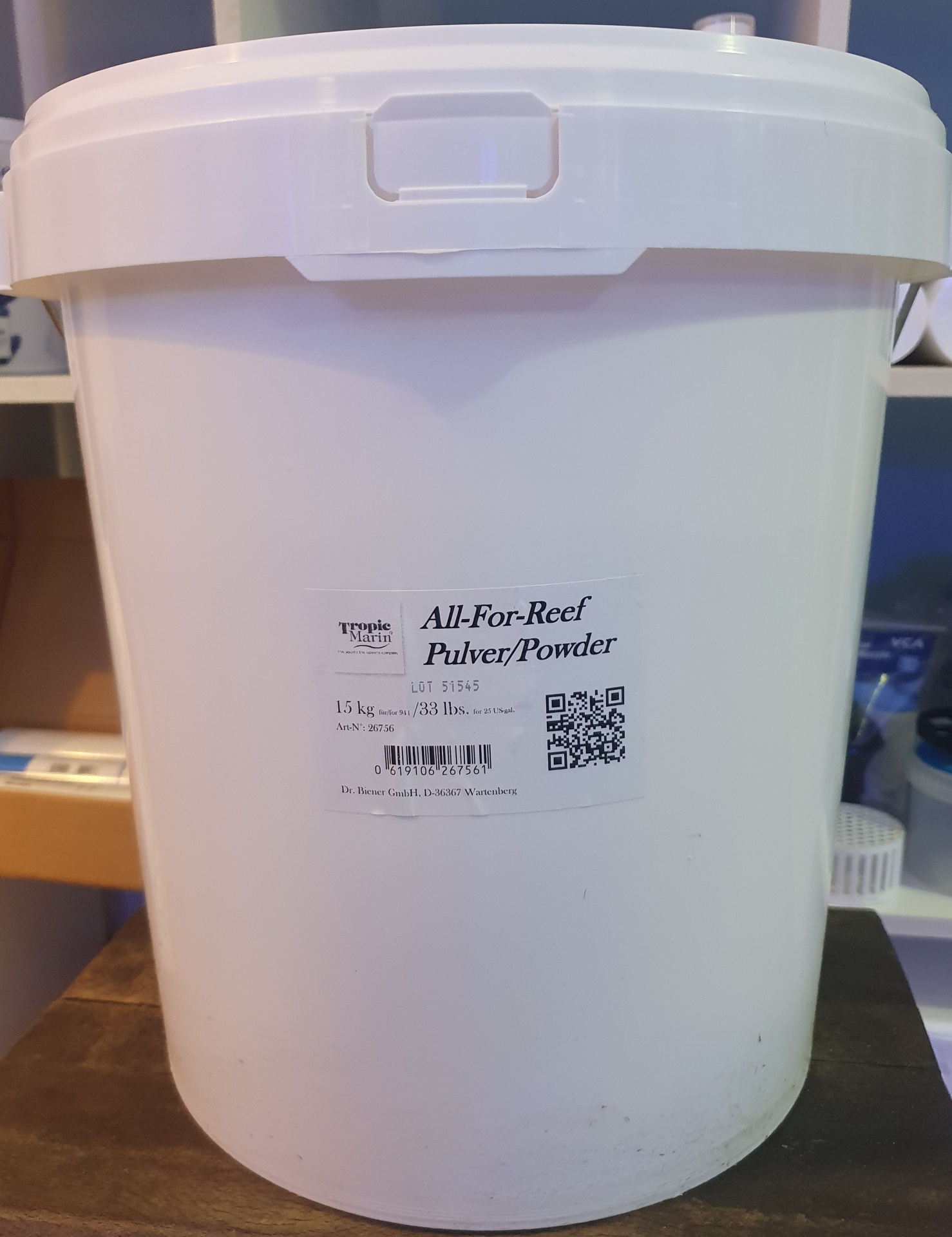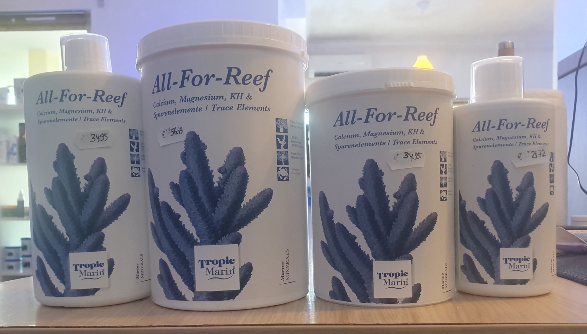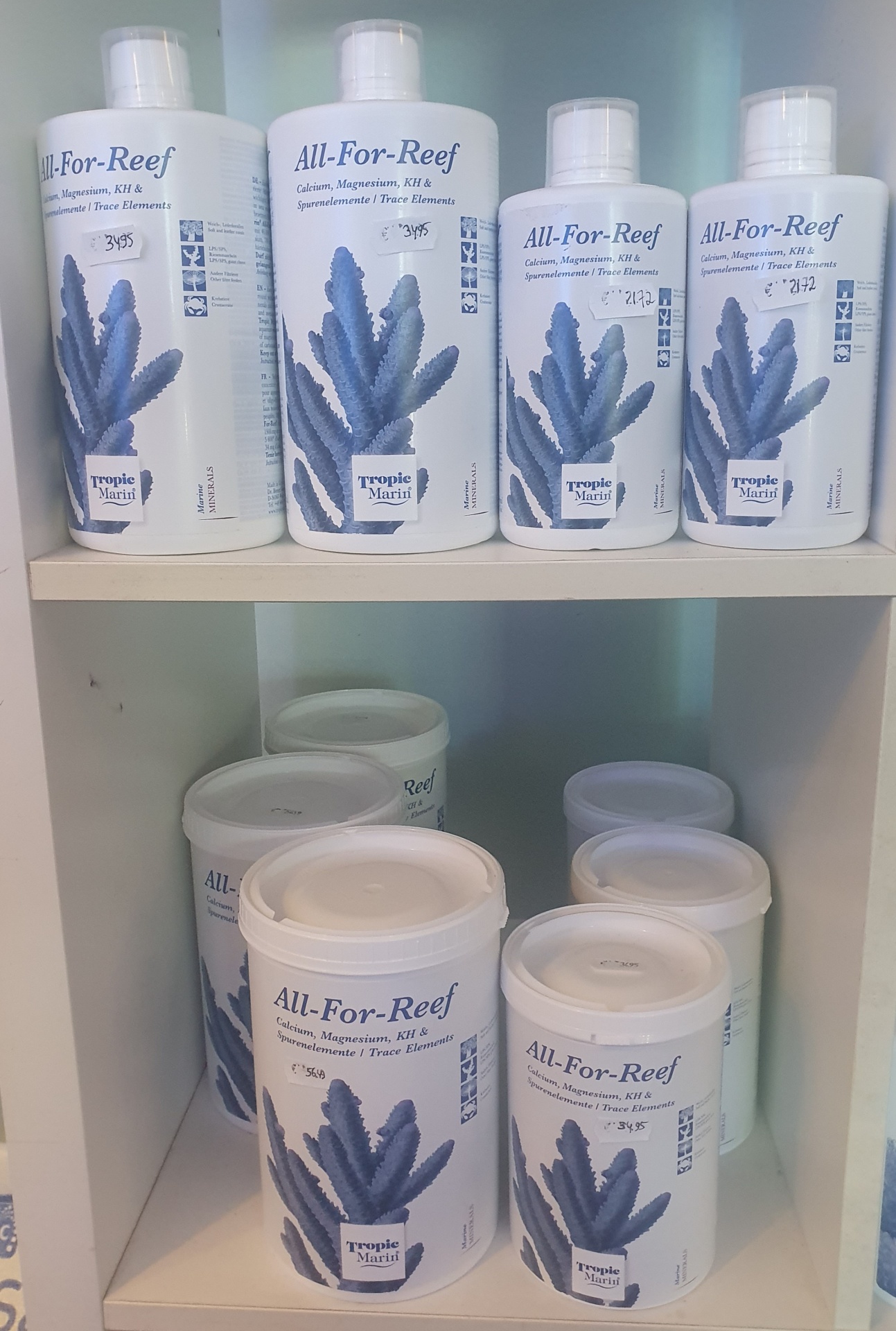 Para preparar a mistura de minerais líquida, dissolvem-se 6 colheres de medição rasas (aprox. 160 g) de All-For-Reef Pulver em 1 litro de água sujeita a osmose inversa. Esta solução conserva-se por muito tempo e contém aprox. 43.000 mg de cálcio, 6.000° de dureza de carbonatos, 1.900 mg de magnésio, 780 mg de estrôncio, e 34 mg de iodo, assim como todos os outros oligoelementos importantes.