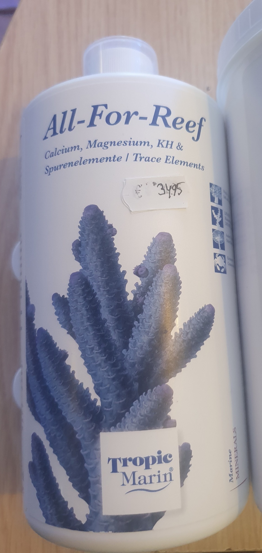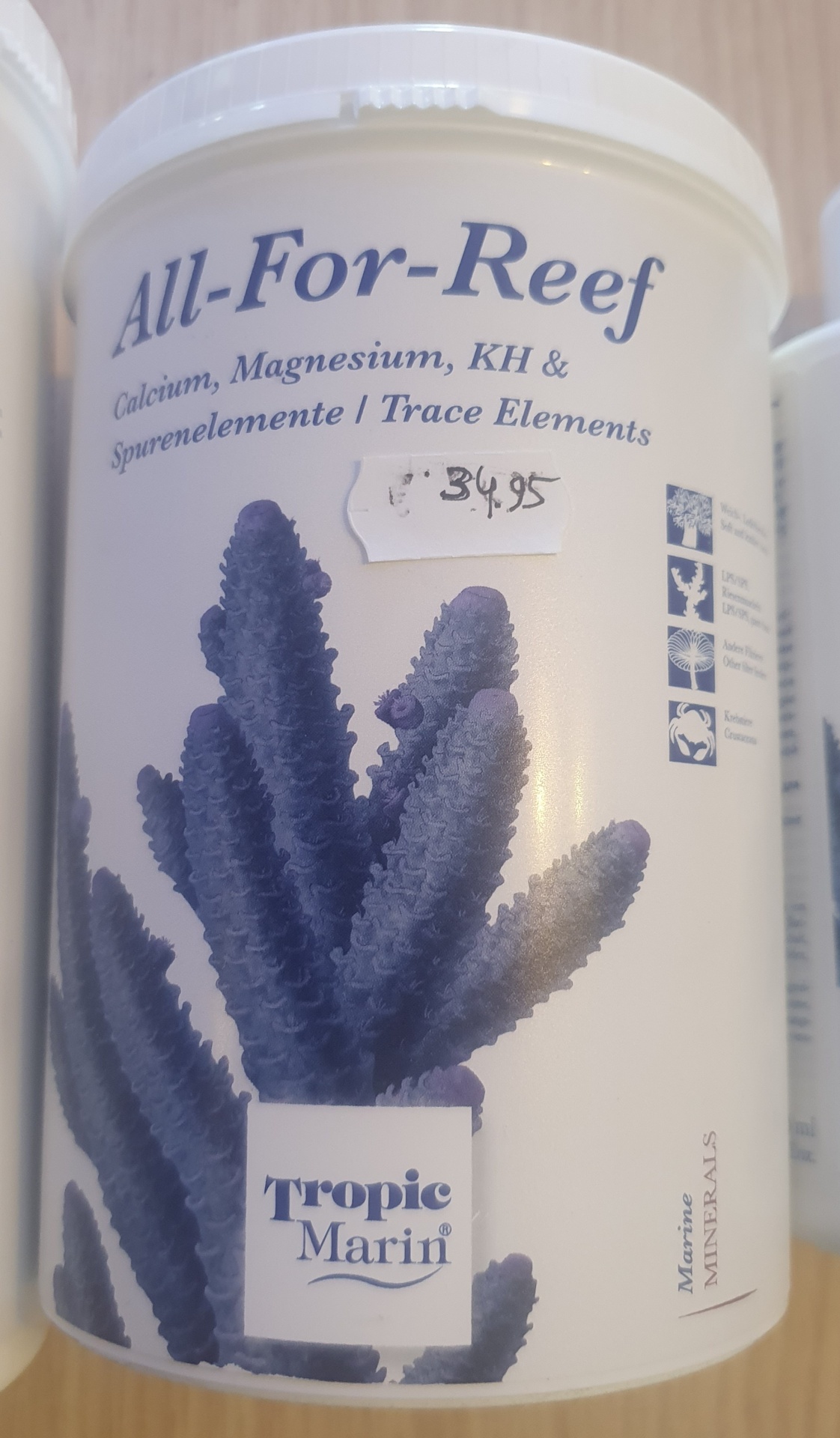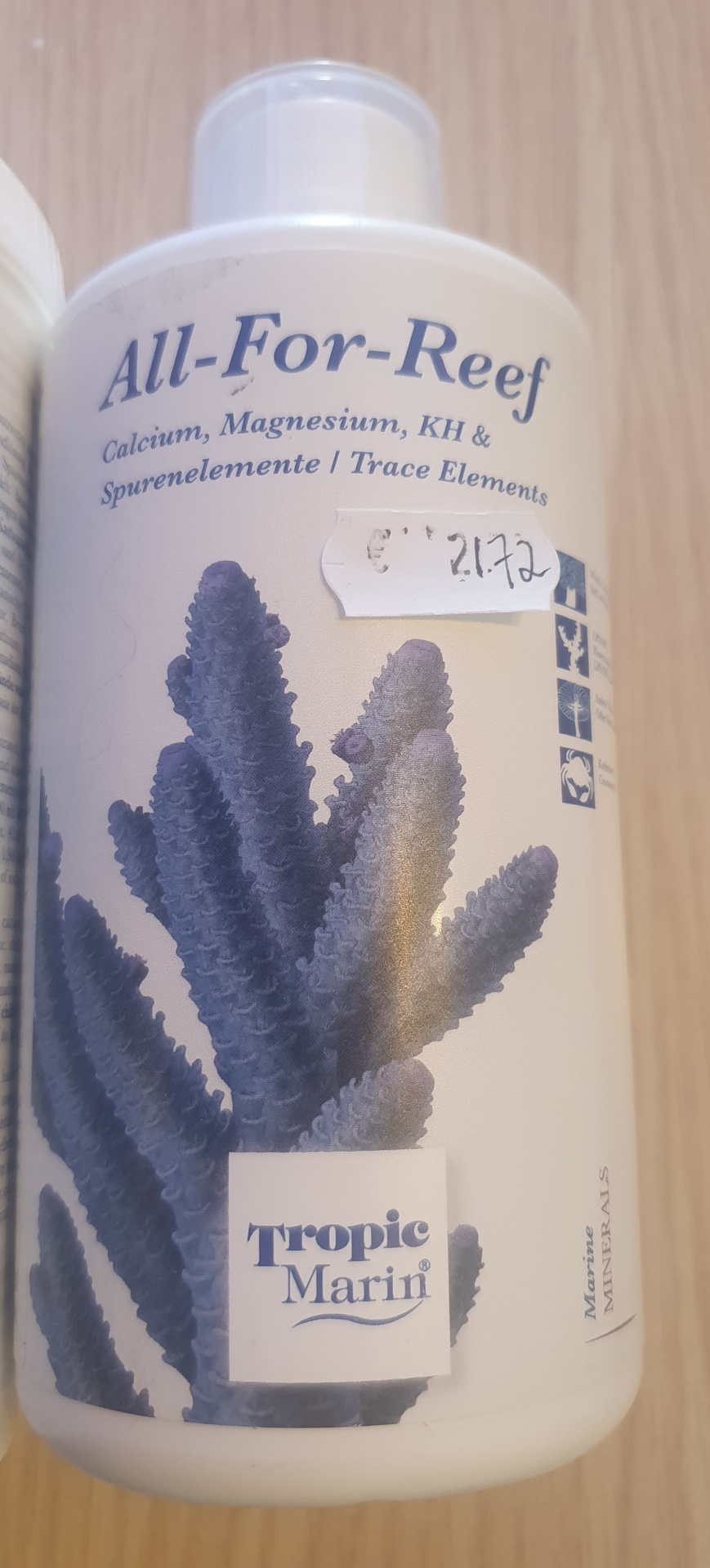 500 ml de ALL-FOR-REEF definido 20.000 mg de cálcio, 950 mg de magnésio, 390 mg de estrôncio, dureza de 2.800 ° carbonato e 17 mg de iodo.