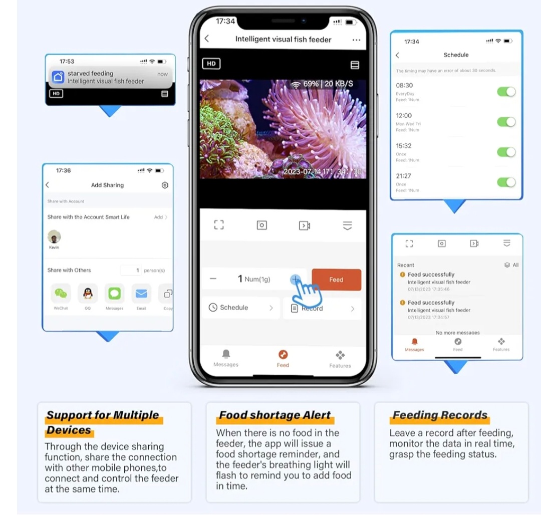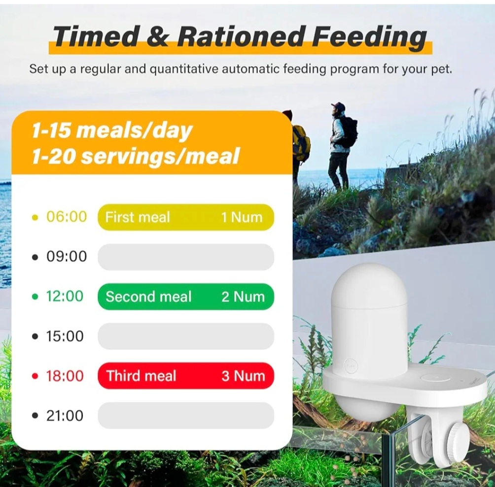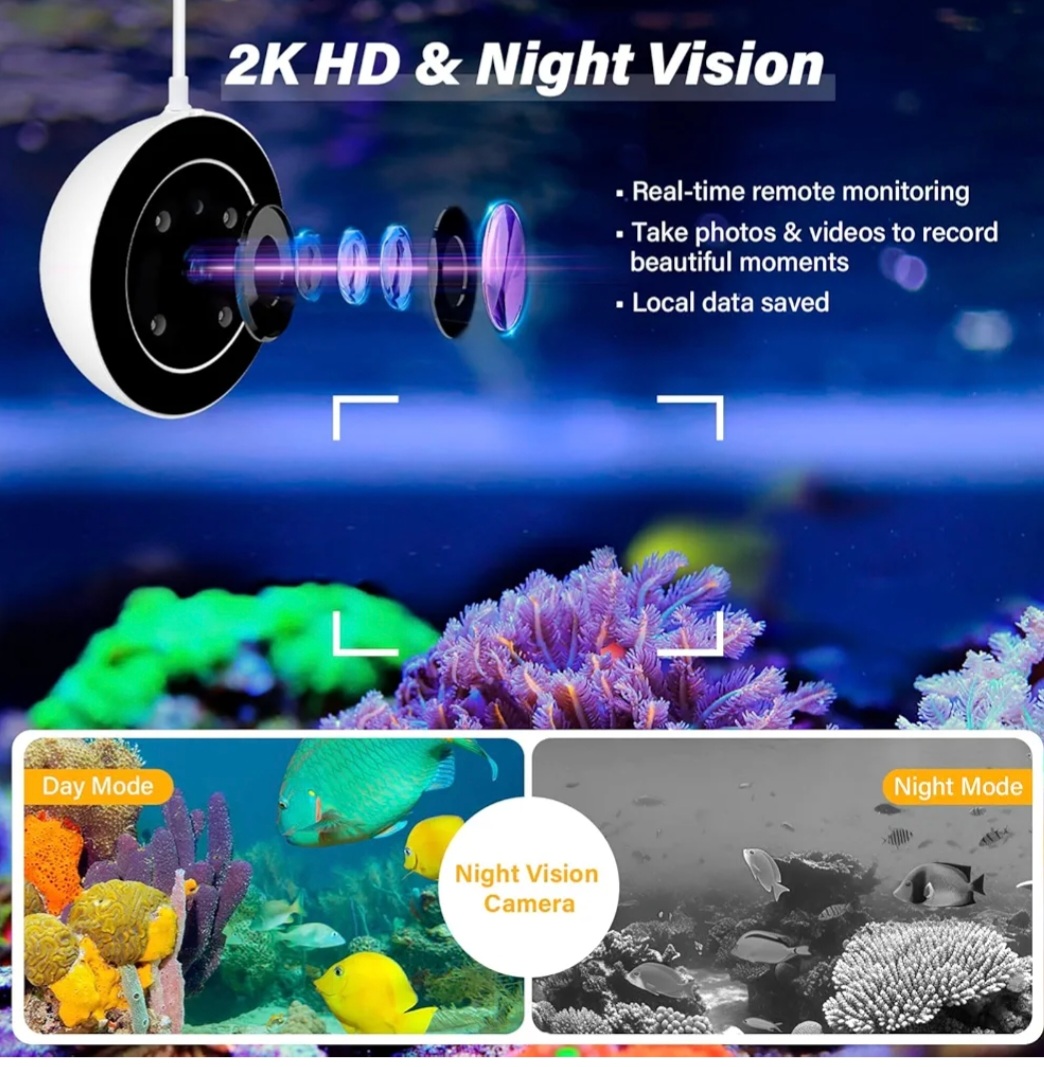 Com o Visual Fish Feeder , você pode alimentar seus animais quando quiser e de qualquer lugar do mundo. Além disso, graças à sua poderosa câmera 2,5K integrada, você desfrutará sempre de uma visão clara e detalhada do interior do seu aquário.