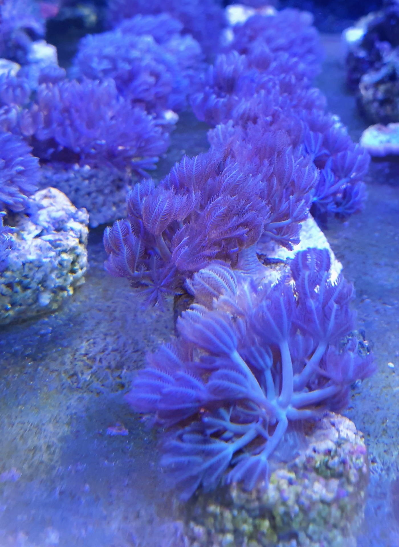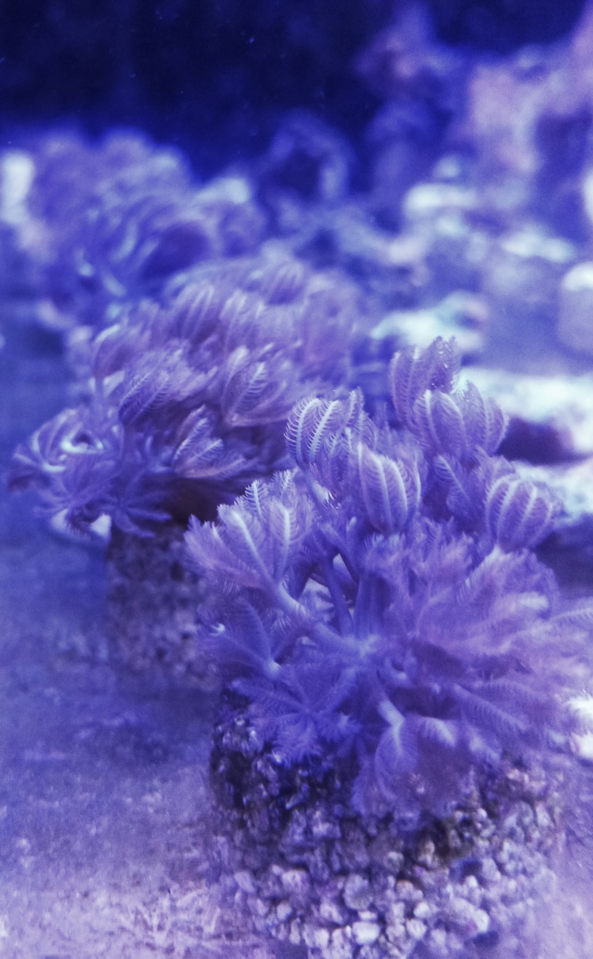 Corais roxos em rochas com textura semelhante a penas em fundo azul escuro