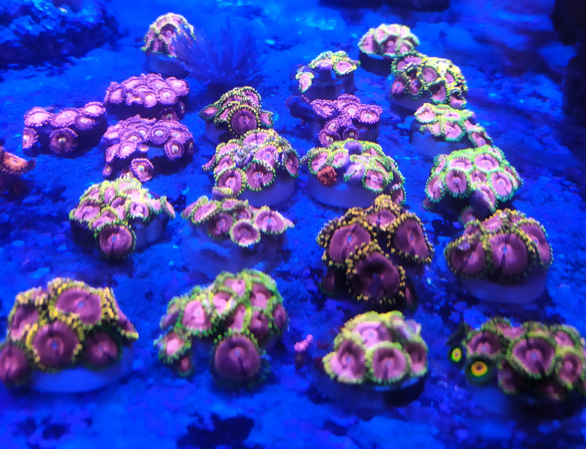 Corais zoantídeos coloridos em bases brancas sob luz azul