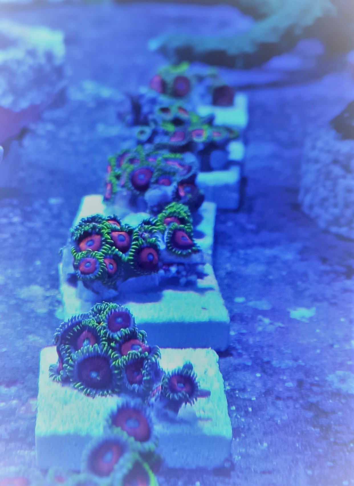 Corais coloridos fixados em blocos brancos submersos em água azul